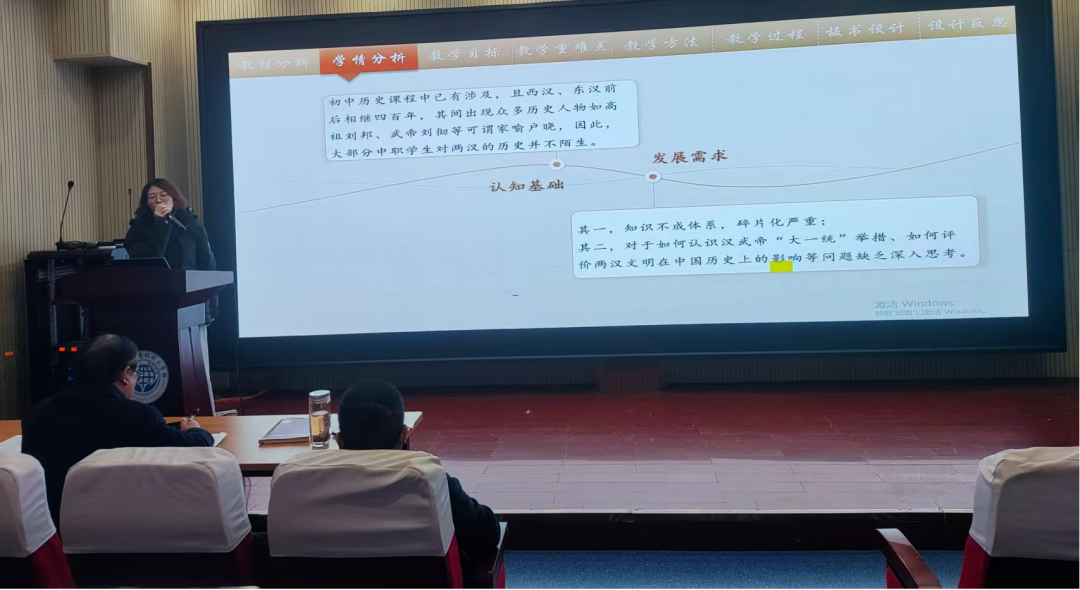 比赛现场,参赛教师们精神饱满,教态自然,他们紧扣新课标理念,立足学科核心素养,从教材分析、学情分析、教学目标、教学重难点、教学方法、教学过程、板书设计等方面进行了详细阐述。