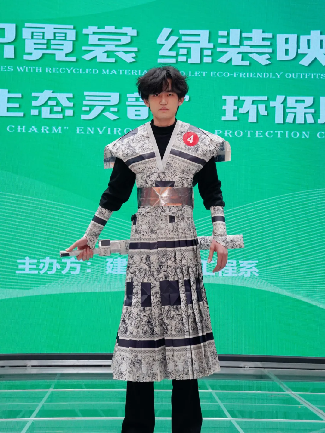 是由废弃奶茶袋制成的锦衣卫飞鱼服。在古代,飞鱼服乃锦衣卫荣耀象征,彰显着大明风华。如今,我们用奶茶袋重塑经典,奶茶袋虽小,却能聚沙成塔,这衣身,奶茶袋巧妙拼接,似波光粼粼,宛如飞鱼鳞片,尽显华贵。以环保践行传承,用创意致敬经典。让我们携手,赋予废弃物新生,延续中华千年的锦绣传奇