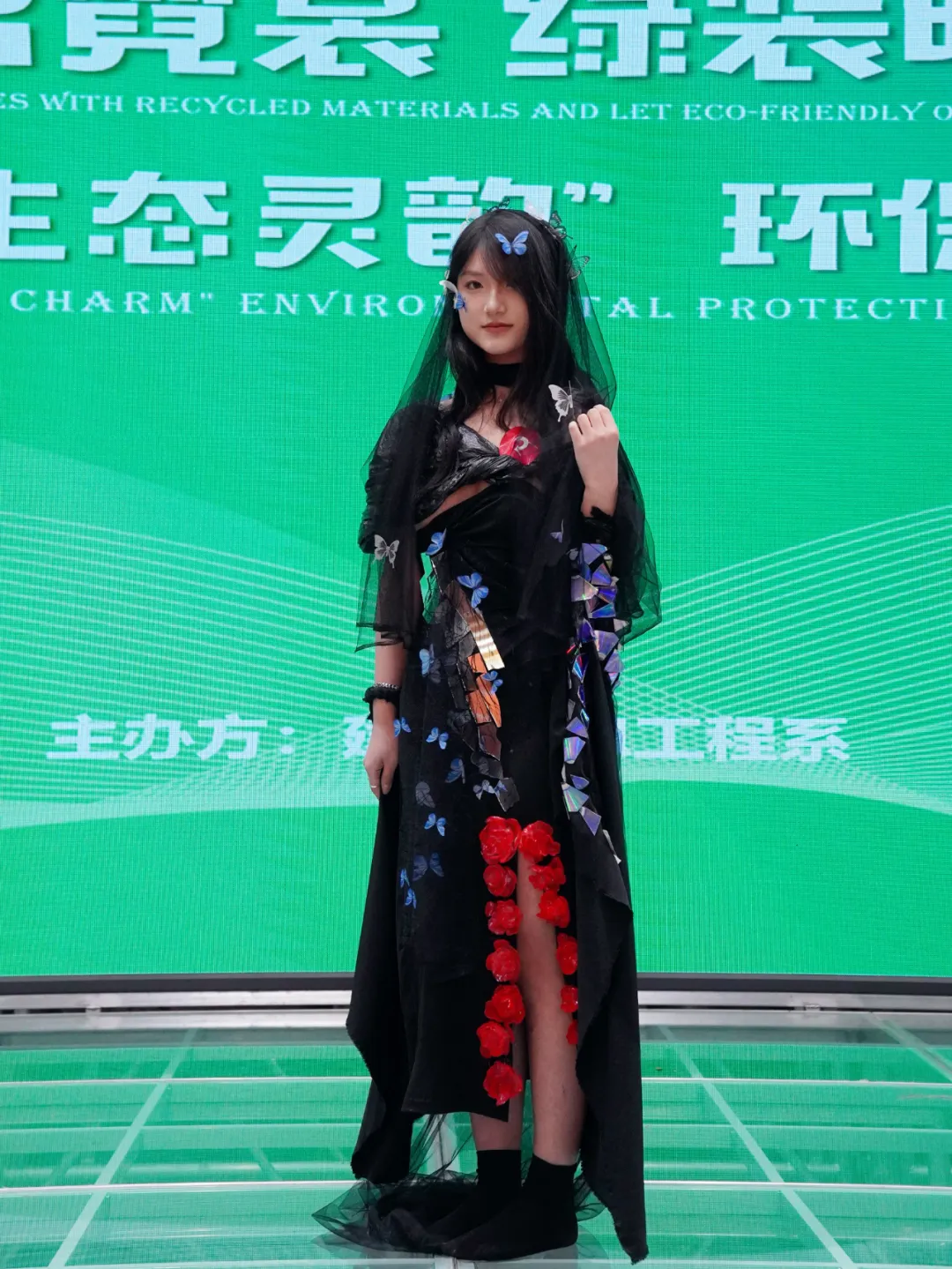 灵感来源于生活中各种废弃物品、取森林生态相貌,为作品创作目标。蝴蝶与玫瑰为设计元素,黑纱笼罩,彰显自然的艺术魅力。色彩上主色调为暗色系,搭配彩色光碟。头纱与尾部都由生活中的蚊帐制成,礼服开口处用废弃的塑料瓶烧制而成,拖尾处和手臂处用垃圾袋作为装饰设计,裙身上加了碎玻璃元素,礼服背后是由三十多张光碟碎片拼成的蝴蝶翼。呼吁保护自然,环保生活。