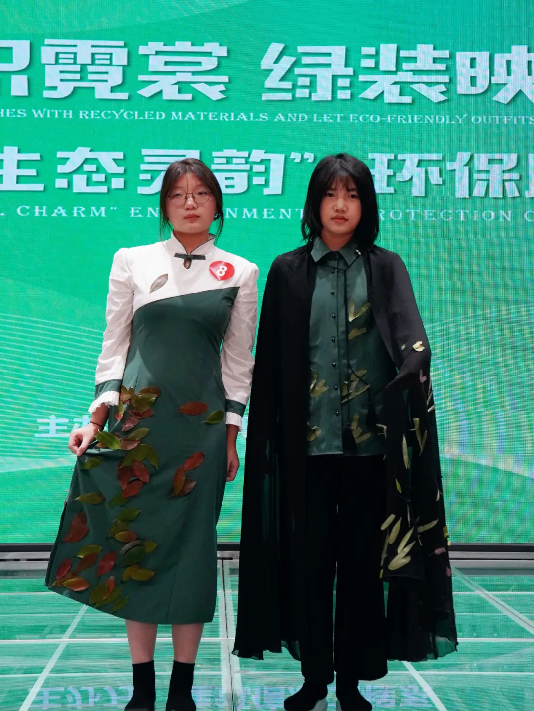本组两套参赛服装从制版、剪裁、缝纫、装饰都是自己手工完成。我们希望借两套作品,呼吁大家将废弃物再生,共创新美学。第一套作品借用自然、清雅的竹子为主题图案和主要材料,借鉴古代侠客的着装作为设计灵感。衬衣面料上用叶片作为装饰,充满生机,八粒藏青色圆形纽扣井然有序的排列着,尽显国风韵味。黑色网纱斗篷飘逸脱俗,斗篷上同样缀有竹叶,除了竹叶,还有枫叶、香樟树叶...形状各异的叶子错落有致,斗篷前垂下的穗子随风飘扬。下身的黑色长裤搭配长筒方形皮靴,如竹般利落干脆,刚柔并济。第二套作品主材料仍以叶子为主,从大自然汲取的墨绿色和白色作为主色调。旗袍自1929年被定义为女性的国服,底蕴十足。在设计细节上,我们将古老中国结的一种——盘扣融入到作品中。旗袍袖口的褶皱用各式各样的叶子进行装饰,搭配珍珠环腿黑高跟,保留东方韵味的同时,在新时代绽放光彩。
