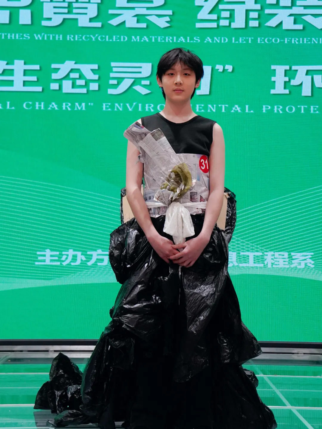 本套参赛环保服装主材质选用绿色绸缎,仿若春日里的静谧湖面,果绿色网纱与白色网纱轻盈交织,如林间透过的缕缕微光,灵动飘逸。搭配绿叶和废弃报纸做成的花朵装饰,尽显自然之美。上衣领口处的环花及腰间纸花皆由废弃报纸制成,整体呈优雅鱼尾裙造型,绿色绸缎贴合身形,在腰间以纸花装饰,褶皱处理更添层次感。旧蚊帐化身泡泡纱袖上的白色蝴蝶结和腰后轻盈拖尾,实现废旧物品的华丽转身,传递环保与时尚共融的理念。
