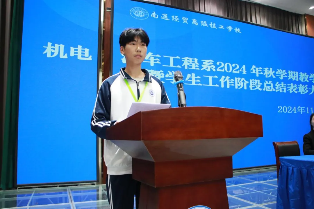24级机电4班的学生代表徐家乐同学上台发言,他的话语中充满了爱国、爱家、爱校的情感和对学习的热爱以及对未来的无限憧憬。
