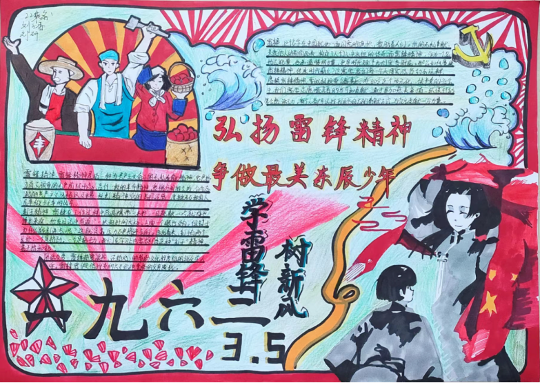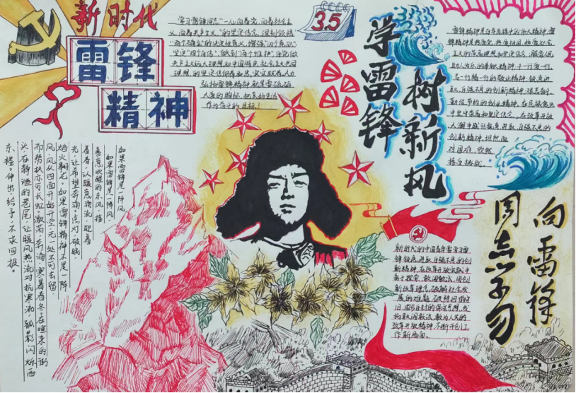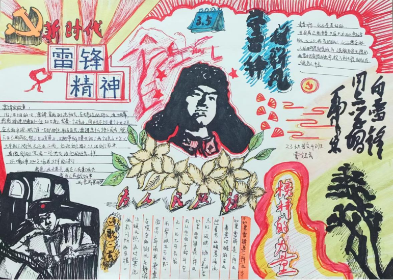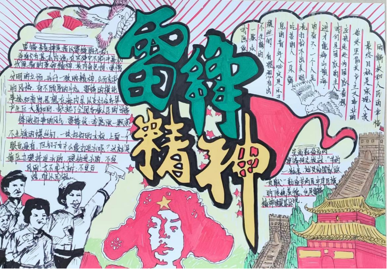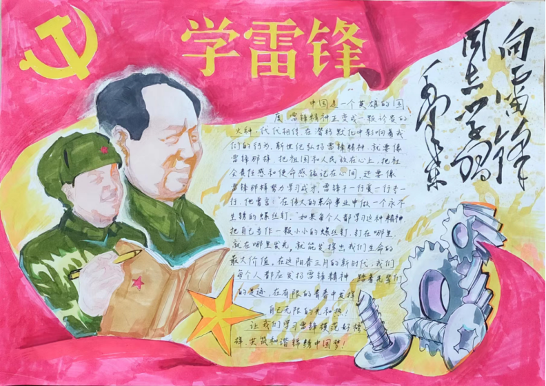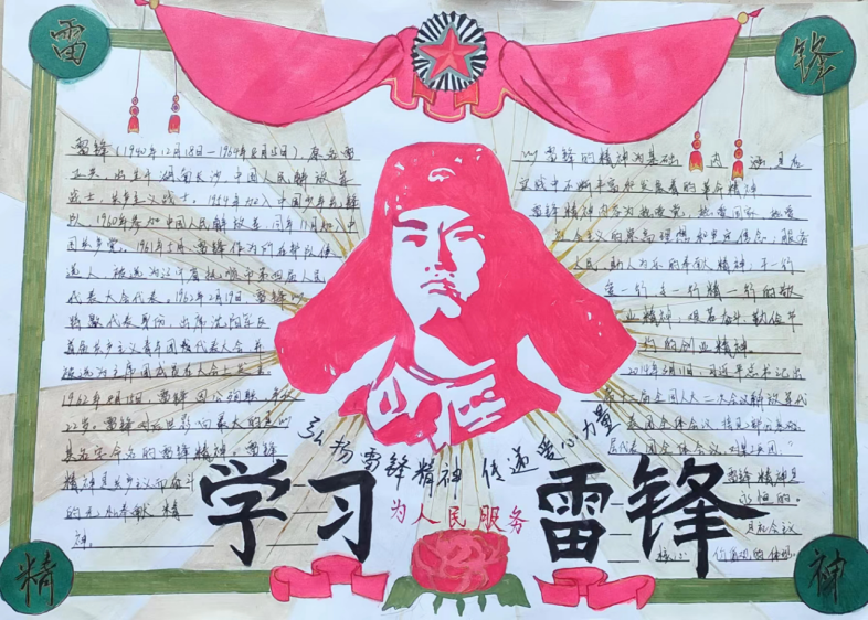 有这么一个人,他的名字,叫雷锋;还有这么一种精神,叫“雷锋精神”。“雷锋精神”是以雷锋同志的名字命名,以雷锋的精神为基础内涵,是在实践中不断丰富和发展的革命精神,是全心全意为人民服务,为人民的事业无私奉献的精神。1962年8月15日雷锋同志因公殉职,1963年3月5日毛主席为雷锋同志题词“向雷锋同志学习”,每年的3月即为“学习雷锋月”。甲辰三月,万里春分,在第61个雷锋月到来之际,我校团委开展了以“学习雷锋好榜样”为主题的手抄报活动。 同学们认真学习雷锋精神,响应“向雷锋同志学习”的口号,将自己学习所得,用色彩和线条展示雷锋精神的风貌,用语言和文字书写雷锋精神的真谛。一张张栩栩如生的手抄报,每一个笔触,每一张画纸,都讲述了一个动人的故事。在雷锋的精神里,每一句感谢都默默无名,每一次付出都收获温暖,每一个瞬间都可以永恒。通过本次手抄报活动,同学们对雷锋同志的光辉事迹有了更多的了解,对雷锋精神也有了更进一步的认识。“一滴水只有放进大海里才不会干涸,一个人只有把自己和集体的事业融合在一起才能最有量。”希望在接下来的学习生活中,同学们充分学习雷锋同志敢挤,肯钻的“钉子”精神,迎难而上,踔厉前行。